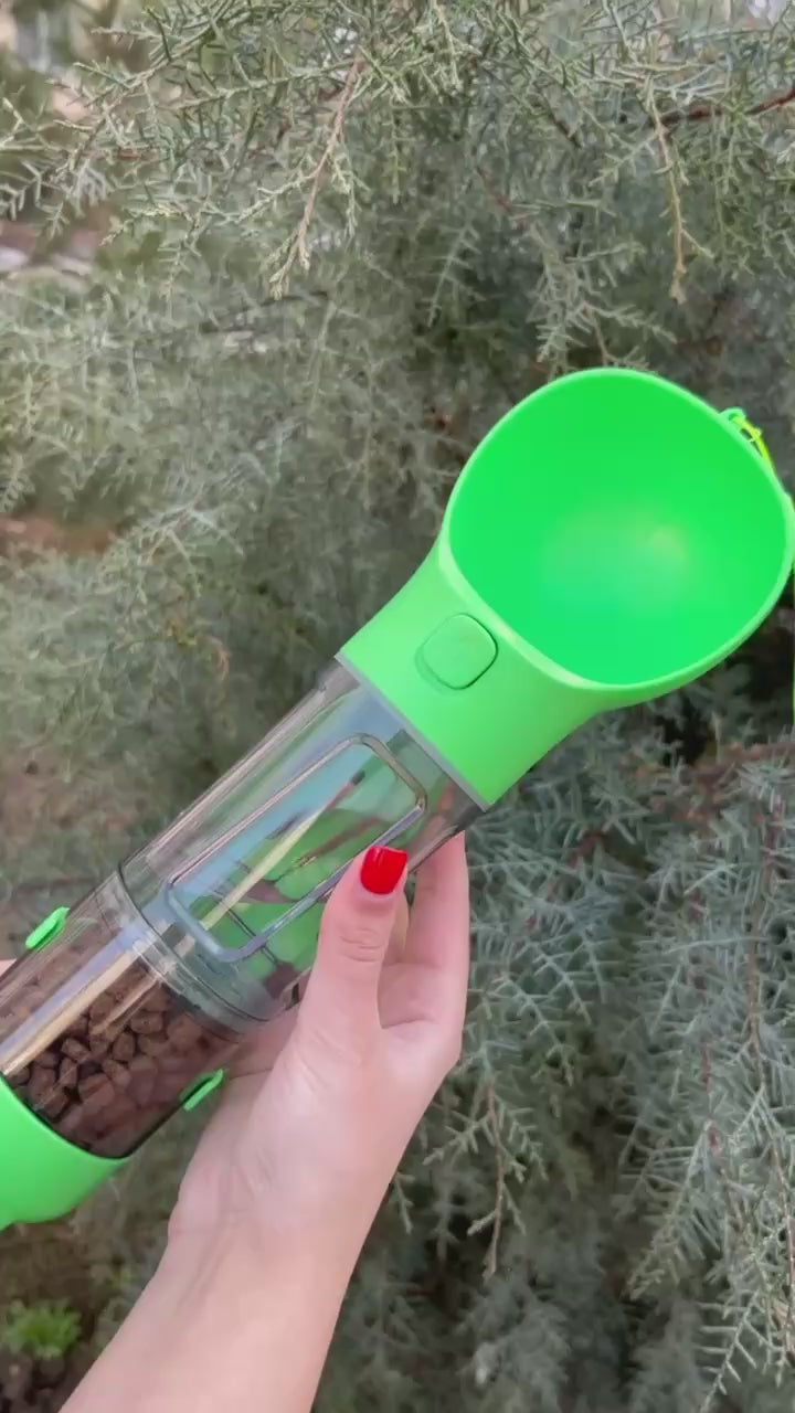 ☀️4 in 1 drinking bottle for small and large breeds, meet all your needs. Portable dog water bottle has 4 functions: water, food, poop scoop and trash bag. Your pet will no longer be hungry when you go for a walk, because this bottle has everything you need.